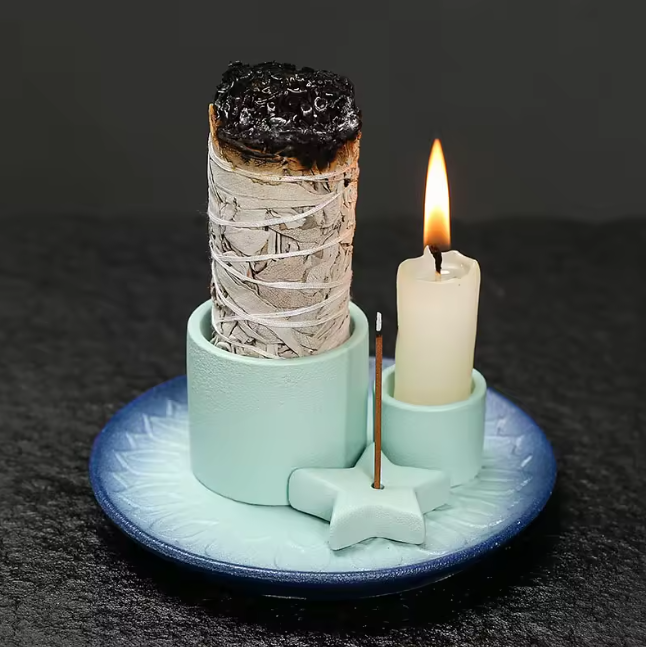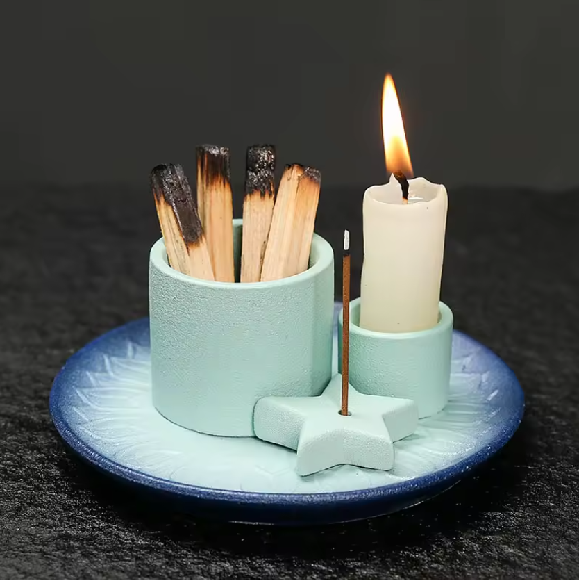This handcrafted 3-in-1 offering plate is designed to bring fire, fragrance, and intention together in a single, grounded arrangement.